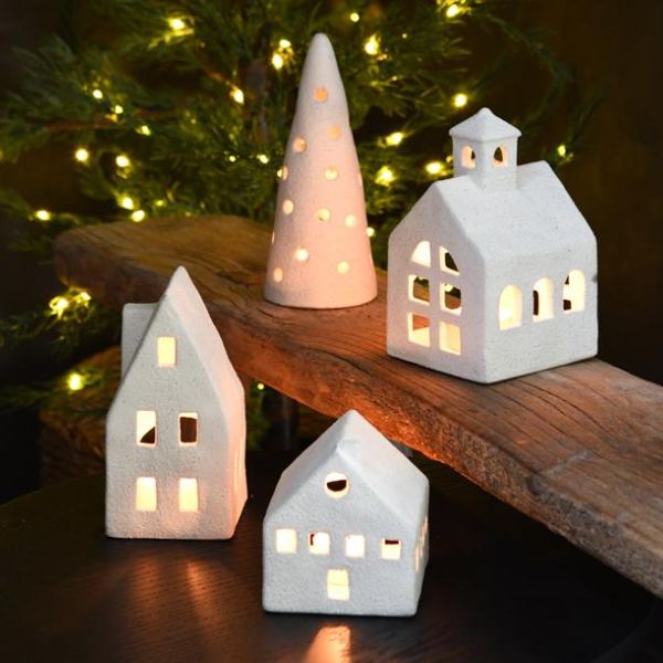 Dit keramieken waxinelichthuisje geeft je huis een gezellige kerst sfeer. Zet er een waxinelichtje in en geniet van het warme licht dat door de raampjes schijnt. Perfect voor de feestdagen!