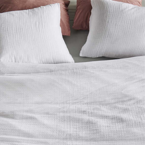 Dit dekbedovertrek Optimism White komt uit de collectie van At Home by Beddinghouse. Dit witte overtrek is bijzonder doordat de voorkant is gemaakt van drie laags hydrofielkatoen, ook wel mousseline genoemd. Deze laagjes stof zijn licht getwist, waardoor het een kreukeleffect krijgt. De stof zorgt ervoor dat het dekbedovertrek huidvriendelijk en luchtig is, goed vocht absorbeert en snel droogt. De achterkant van het overtrek is gemaakt van 100% katoen. Het overtrek heeft over de gehele breedte aan beide zijden een dubbele instopstrook. Dekbedovertrek Optimism is verpakt in een mooie stoffen tas voorzien van hengsel, gemaakt van hetzelfde materiaal als het overtrek, deze is herbruikbaar.