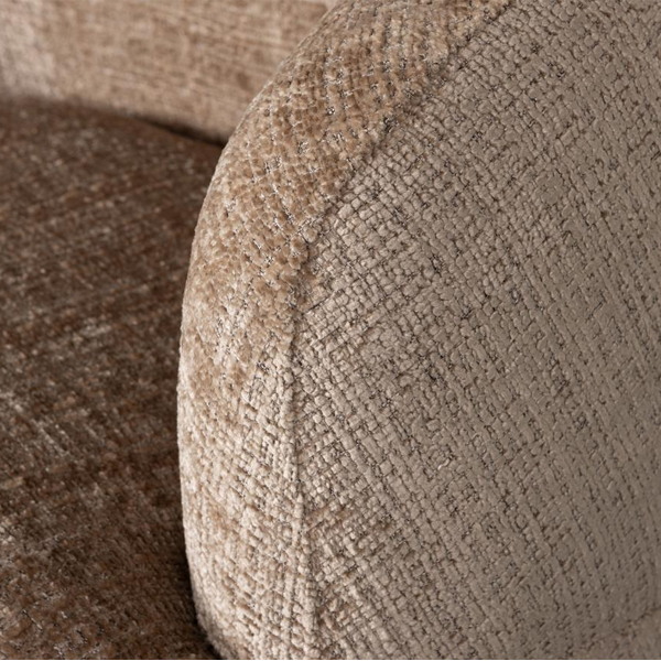 Deze fauteuil is gemaakt van grof geweven stof met onregelmatig weefpatroon. Deze chenille stof heeft een opvallende structuur, wat zorgt voor een luxe uitstraling en bijzondere glans. De zachte stof is gemaakt van 100% polyester. De chenille met grove structuur heeft een Martindale van 100.000 en is dus goed bestand tegen lussen, verkleuring en slijtage.