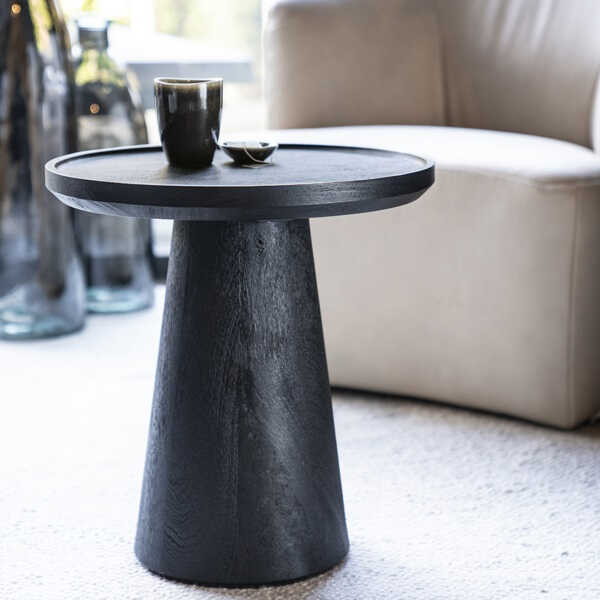 Deze luxe bijzettafel Ron Zwart komt uit de nieuwe collectie van het merk Eleonora. Deze ronde bijzettafel is vervaardigd uit mango hout en afgewerkt met een zwarte coating. De tafel heeft een kegelvormige voet en een rond blad. Mooi detail aan het tafelblad is de verjongde onderkant en de opstaande rand. Door het subtiele design heeft bijzettafel Ron een stoere maar rustige uitstraling. Deze bijzettafel heeft een afmeting van Ø46x49cm. Deze tafel is verkrijgbaar in drie verschillende afmetingen die tevens in combinatie te gebruiken zijn. Door de diverse hoogtes kunnen de tafels elkaar deels overlappen voor een speels geheel.