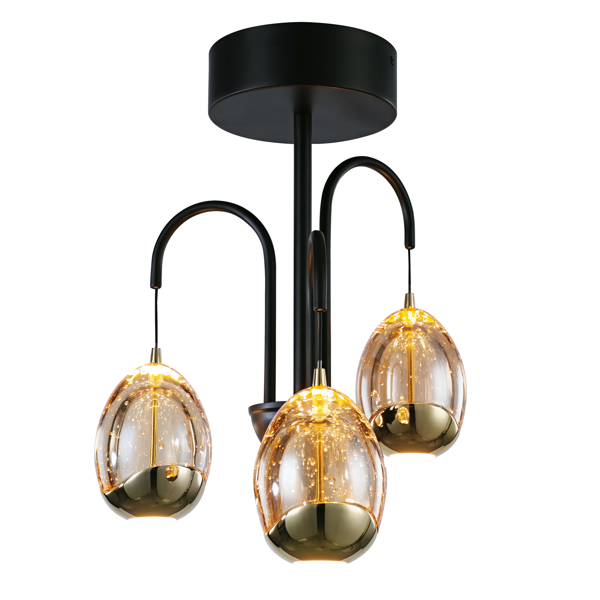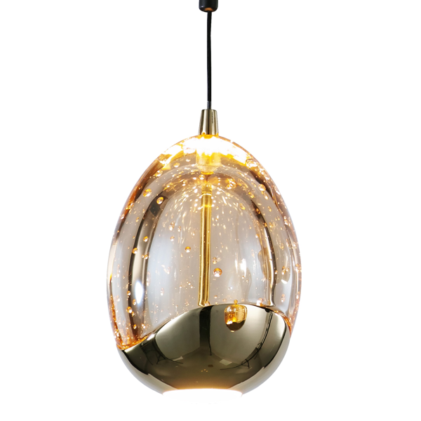 Deze trendy Egg plafonniere is een chique plafonniere voorzien van een mooi amber glas. In het glas bevinden zich kleine bubbeltjes en omdat de LED lichtbron zowel naar beneden als naar boven licht geeft ontstaat er een schitterend licht effect in het glas. Onder het glas bevindt zich een goud kleurige metaal plaatje en de ophanging heeft een zwarte kleur. De LED lampen verbruiken ieder 5W en geven een mooi warm wit licht (2700 Kelvin). Goed dimbaar met een LED dimmer (excl).
