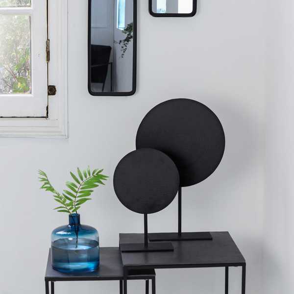 Dit prachtige lood-kleurige LASIM ornament bestaat uit een ronde schijf met een patroon op een zwart metalen voet. Een echte eyecatcher in je interieur!