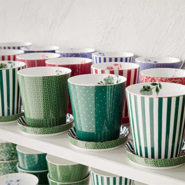 Dit mooie mokje met theetip is onderdeel van de Royal Dots collectie van Pip Studio. Deze set bestaat uit een oorloze mok met bijpassend theetipje. De set is gedecoreerd met vrolijke groene stippen en strepen en zijn goed te mixen & matchen met de rest van deze collectie. De mok is gemaakt van 100% porselein en heeft een inhoud van 230ml. De theetip heeft een diameter van 9cm. Verkrijgbaar in verschillende prints en kleuren.