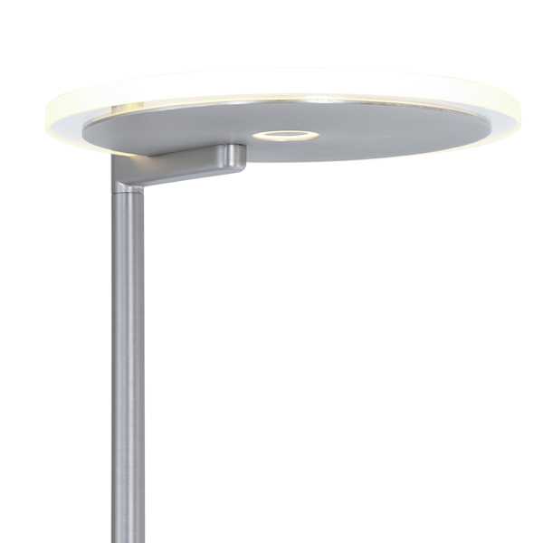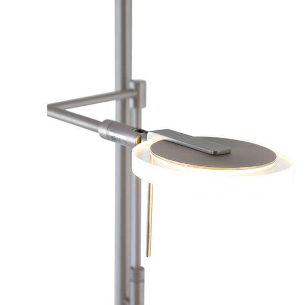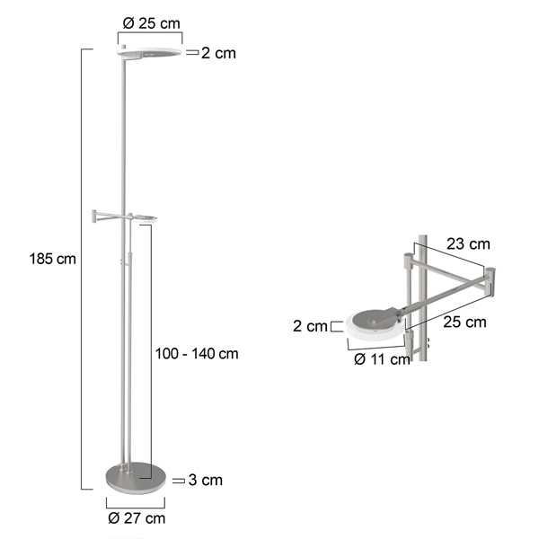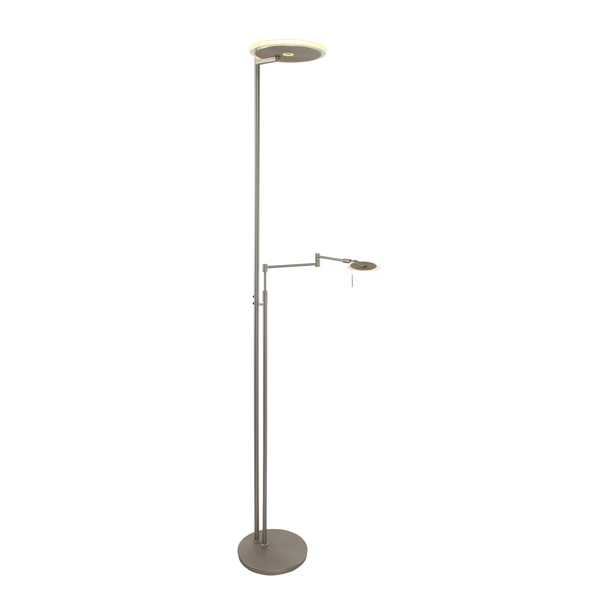 Deze stalen vloerlamp, gemaakt van metaal, is voorzien van zowel een leeslamp als een uplight. Beiden worden inclusief LED module geleverd welke (individueel van elkaar) te dimmen zijn via de pulsdimmers op de stang. De leeslamp bevat een lichtbron van 10 Watt en de uplighter 40 Watt, die zorgen voor een enorme lichtopbrengst. De totale hoogte van de lamp is 187cm.