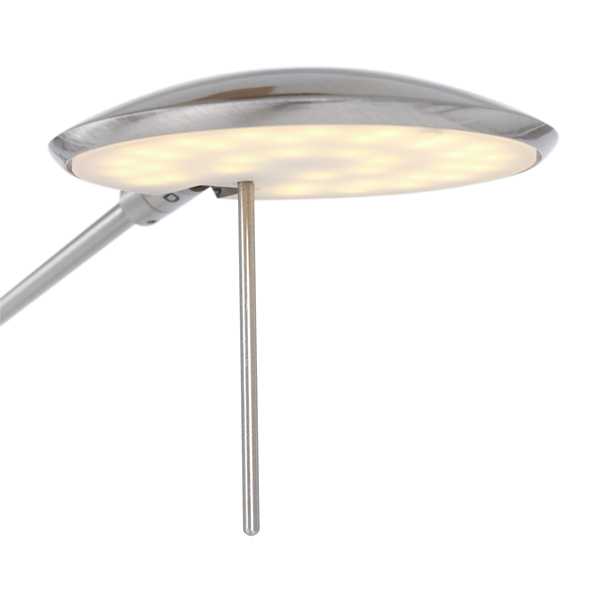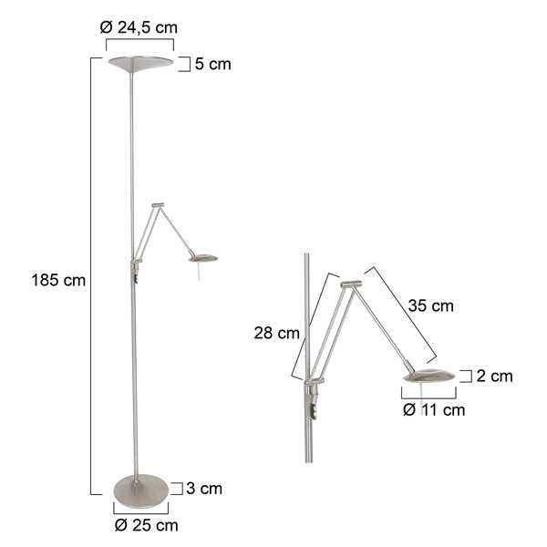 Deze stalen vloerlamp is voorzien van twee lampen, namelijk een leesarm en uplight. Deze twee lampen zijn afzonderlijk te bedienen dankzij de dubbele pushdimmer op het frame. Als de lamp op zijn felst staat, is het erg fel en goed om bij te kunnen lezen. Door de uitklapbare leesarm en draaibare reflector is het licht eenvoudig te richten. De totale hoogte van deze vloerlamp is 185 centimeter.