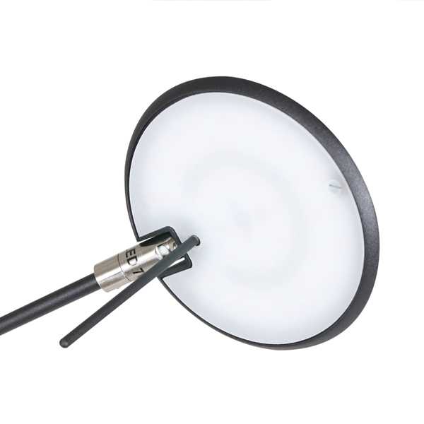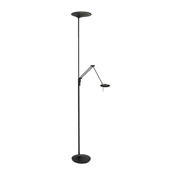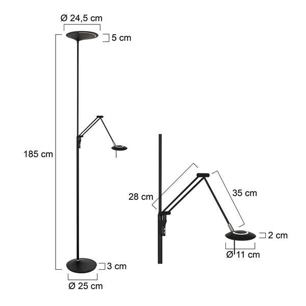 Deze zwarte vloerlamp is voorzien van twee lampen, namelijk een leesarm en uplight. Deze twee lampen zijn afzonderlijk te bedienen dankzij de dubbele pushdimmer op het frame. Als de lamp op zijn felst staat, is het erg fel en goed om bij te kunnen lezen. Door de uitklapbare leesarm en draaibare reflector is het licht eenvoudig te richten. De totale hoogte van deze vloerlamp is 185 centimeter.