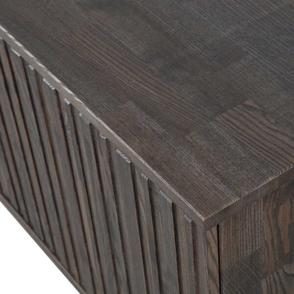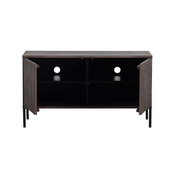 Dit toffe tv-meubel New Gravure Essen Espresso komt uit de collectie van het Nederlandse interieurmerk WOOOD. Dit tv-meubel is uitgevoerd in essenhout en afgewerkt met een warmbruine, espressokleurige beits. Het interieur is vervaardigd uit zwart spaanplaat. De poten zijn van metaal met een zwarte coating. Het Gravure New tv-meubel beschikt over twee deuren met een geluidloos push-to-open systeem.