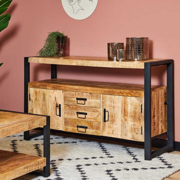 Dit dressoir komt uit de Boaz serie en is uitgevoerd in massief mangohout. Het metalen frame en de metalen handgrepen zijn afgewerkt met een zwarte lak. Dit model is voorzien van drie lades en twee deuren. Achter de deuren zitten handige legplanken. Het dressoir is ingelegd met verschillende stroken gelakt hout, waar het meubel zijn eigentijdse karakter aan te danken heeft. Dit dressoir heeft een breedte van 135cm, een diepte van 45cm en een hoogte van 80cm. Erg mooi in combinatie met de andere meubelen uit de Boaz serie. Bekijk hier de gehele Boaz serie!