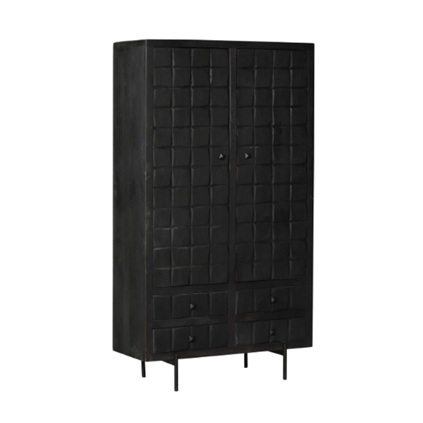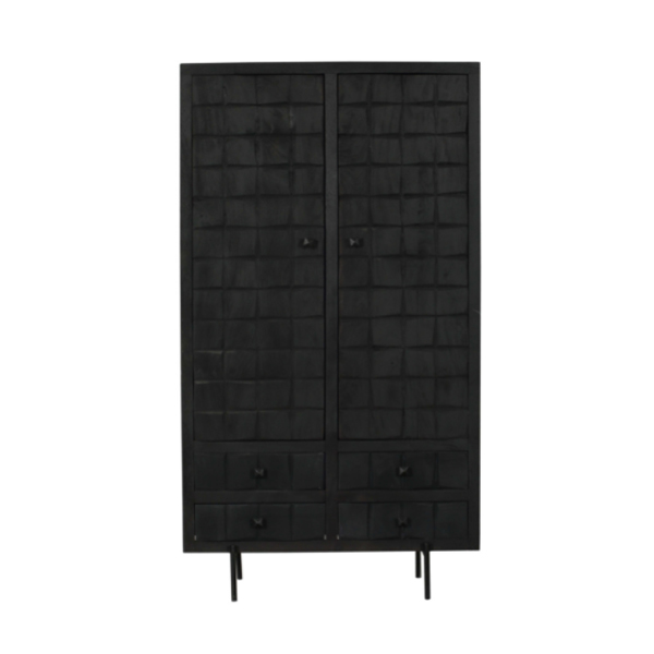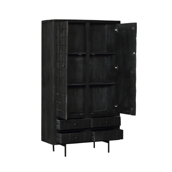Dit stoere kabinet Brandy is uitgevoerd in zwart gelakt mangohout met een metalen poot. Dit kabinet is voorzien van 2 deuren en 4 lades. Dit zorgt voor genoeg opbergmogelijkheden. Door het insnijden van het hout is een een blokken patroon ontstaan. Dit patroon is kenmerkend voor de Brandy serie en geeft het een unieke uitstraling.