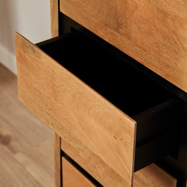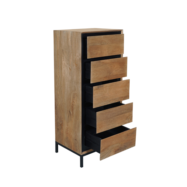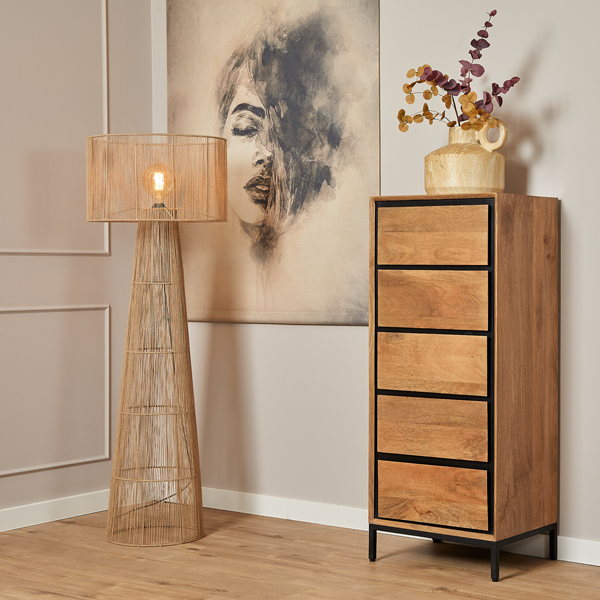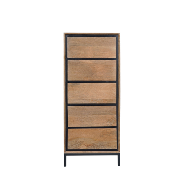 Deze stoere ladekast is gemaakt van gelakt mangohout en staat op een modern zwart metalen frame. Het gave design van ladekast Sion komt door de verschillende stroken mangohout die in het front zijn verwerkt. Met vijf greeploze lades biedt deze kast lekker veel opbergruimte.