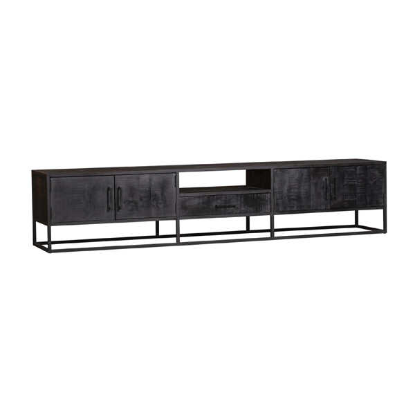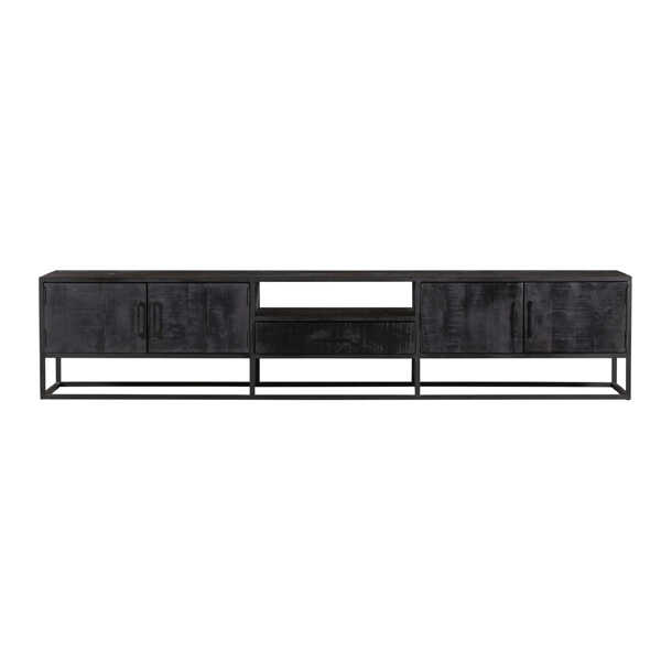 Dit tv-meubel komt uit onze Jennifer serie en heeft één lade, een open vak en twee deuren. De kast is uitgevoerd in massief mangohout en is behandeld met een zwarte lak. Het frame en de handgrepen zijn gemaakt van metaal en afgewerkt met een zwarte lak. De afmeting van TV-meubel Jennifer is 240cm breed, 45cm diep en 50cm hoog.