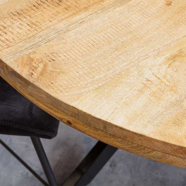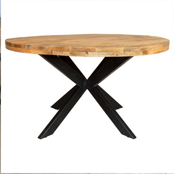 Ronde Jennifer eettafel van 150cm met een blad van mangohout (met een transparante lak). De tafel is voorzien van een matrixpoot, welke is uitgevoerd in metaal met zwarte coating. Het tafelblad heeft een dikte van 6cm, waarvan 3cm is opgedikt.