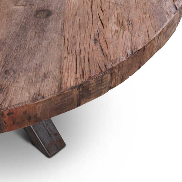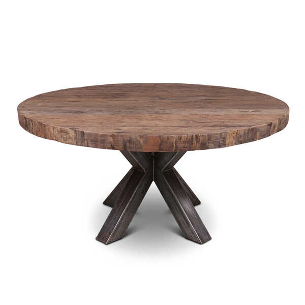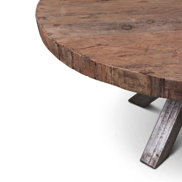 Robuuste, ronde eettafel uit de Stef serie. De stoere eettafel heeft een 160cm blad van gerecycled teak hout en een stoere metalen poot welke ruw is afgewerkt. Iedere Stef eettafel is een uniek exemplaar, dus kan ietwat afwijken van de foto.