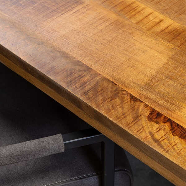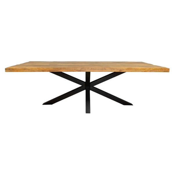Deze prachtige rechthoekige eetkamertafel Jennifer is gemaakt van mangohout. Het mangohout is behandeld met een blanke lak. Het blad is 6 cm dik, waarvan 3 cm opgedikt. De tafel is voorzien van een metalen matrixpoot met een zwarte lak. Verkrijgbaar in meerdere maten.