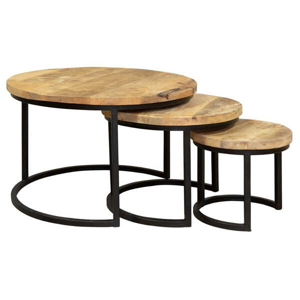 Deze driedelige salontafel set Jennifer bestaat uit een set van drie losse tafeltjes, die je op een speelse manier door de ruimte kunt verspreiden of onder elkaar kunt neerzetten. Deze set brengt veel sfeer en warmte toe aan jouw interieur. De mangohouten bladen zijn gecombineerd met een stalen frame, die zijn behandeld met een zwarte lak. Deze materialen combinatie zorgt voor een industriële look. Je kunt ze gemakkelijk afnemen met een lichtvochtige doek. De afmetingen van deze drie tafels zijn 70x45cm, 50x38cm en 35x31cm.