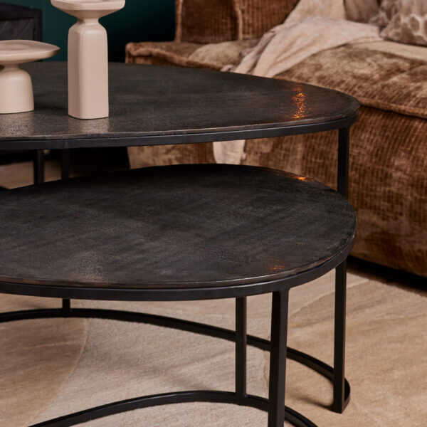 Deze salontafel set Lana is een set van twee zwarte salontafels. De tafelbladen zijn gemaakt van aluminium gecombineerd met een ijzeren frame. De ijzeren frames zijn afgewerkt met een zwarte finish, wat zorgt voor een moderne, industriƫle look. De triangelvormige tafeltjes zorgen voor een speelse look in de zithoek. Het setje sluit dan ook naadloos aan op de moderne en industriƫle woonstijl. Je kunt de hele set gemakkelijk schoonmaken met een lichtvochtige doek. De afmetingen van de twee tafeltjes zijn 65x90x50cm en 50x86x45cm. Bekijk hier de gehele collectie salontafels.